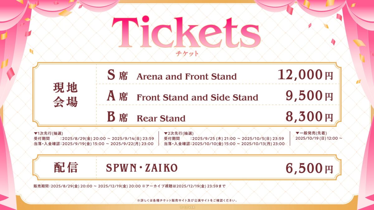 8月29日(金)より現地会場指定席チケットの1次先行(抽選)、『SPWN』『ZAIKO』にて配信チケットの販売がスタートした。