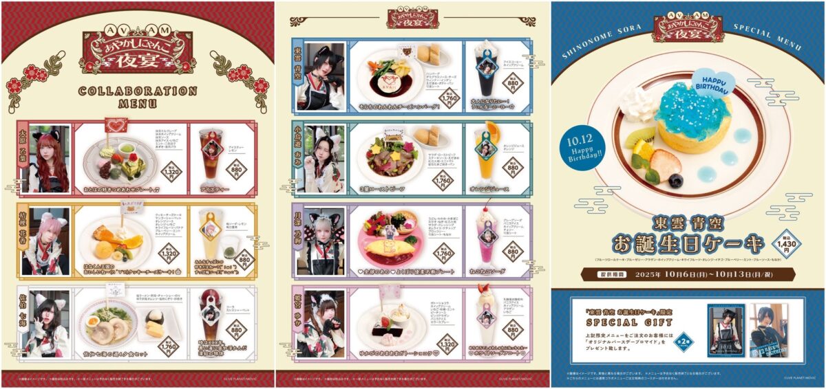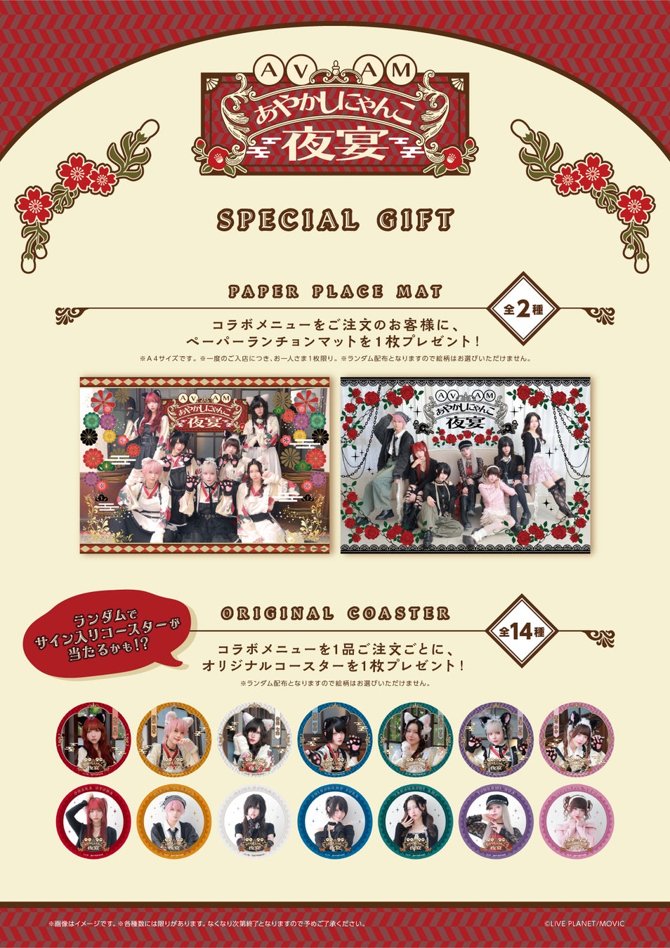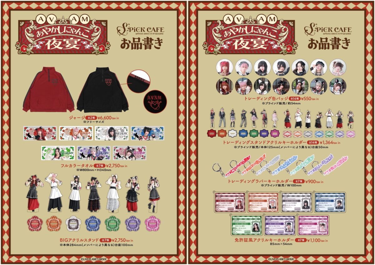 コラボレーションカフェ『AVAM あやかしにゃんこ夜宴』では、少しハロウィンをイメージした猫耳に、大正ロマンをイメージした着物+エプロンの限定のカフェ衣装、今期の新作を交えたSPINNS衣装のビジュアルを始め、メンバー考案のオリジナルメニュー、等身大パネルの展示などを行なう。